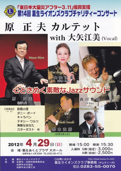 | 2012年4月29日(日)第14回葛生ライオンズクラブチャリティーコンサート 原正夫カルテットwith大矢江美 葛生あくとプラザ |