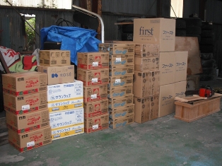| 支援物資 ・中古1tトラック1台、ミシン用糸 水木町 永島幸治様(28箱×12ケース×6本 約2000本100万円相当) ・中古ミシン L芳村陽夫、L田名網学 合計2台、セトモノ L関塚保雄、L春豊彦、L長島隆、L三浦哲、L蓼沼一弘、 L土澤利彦、L橋本真一、L山菅直己、L小平美幸(田沼LC) ・トイレットペーパー(18ロール入) 6袋/箱)×6箱= 36袋 (12ロール入) 8袋/箱)×2箱= 16袋 ・湯たんぽ 30個(6個入/箱×5箱)+7個 ・ホッカイロ 60入/箱10箱・60入/箱10箱(L加藤 実)・60入/箱10箱(L塩田彦之)・40入/箱10箱(L春 豊彦) ・手製まな板70枚(作成L春 豊彦、材料L小平典郎) |