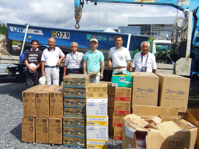 | 2011年8月28日(日)午前3:30 出発 南三陸町“福興市”支援プロジェクト メンバー 関塚保雄、谷晴方、長島隆、春豊彦、菊地豊樹、塩田彦之(6名) 運搬車両 ユニック付4tトラック(L長島 隆) ワゴン車(L春 豊彦) 支援物資 新品扇風機6台(L塩田彦之提供) 中古チェーンソー1台(L春 豊彦提供) 中古船外機付5人乗り用ボート1台(近藤武之様提供) ティッシュ、ラップ、粉せっけん、シャンプー、殺虫剤、台所洗剤 (10万円分 葛生ライオンズクラブ提供) |