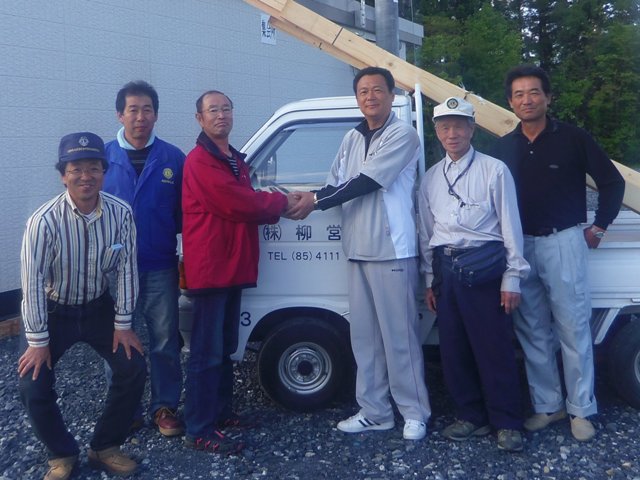 | 軽トラックの寄贈 L菊地豊樹(右から3番目)より 宮城県登米市南方町の仮設住宅の阿部様(左から3番目)へ |