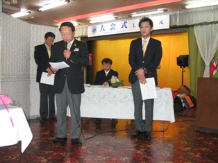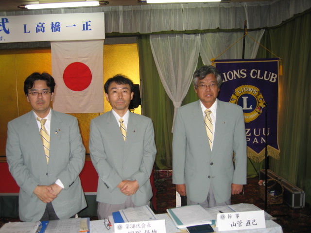 | 本年度三役、左から会計の田名網学、会長の関塚保雄、幹事の山菅直己です。どうぞ一年間よろしくお願いします。 |