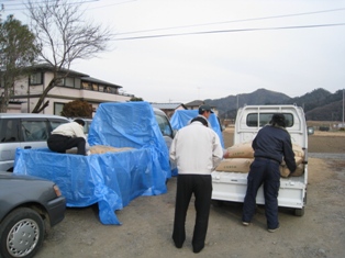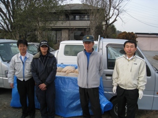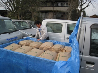 | 2012年1月19日(木)物資積込作業 1月23日(月) 復興支援事業 中古車2台及び支援物資、玄米10俵陸送 届先 宮城県 南三陸志津川LC 中古スバル軽トラック車 2台提供・・・株許電気様 玄米10俵(600Kg)提供・・・牧町、農事組合法人MAGIファーム代表理事 石田憲一様 |