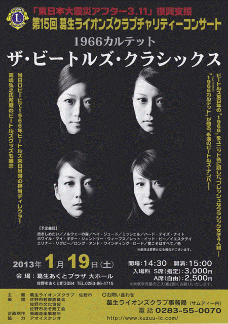 | 2013年1月19日(土)第15回葛生ライオンズクラブチャリティーコンサート 1966カルテット ザ・ビートルズ・クラシックス 葛生あくとプラザ |