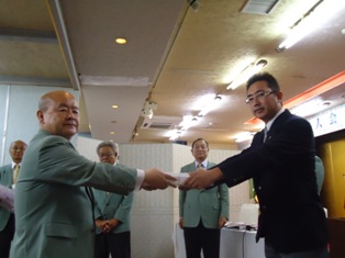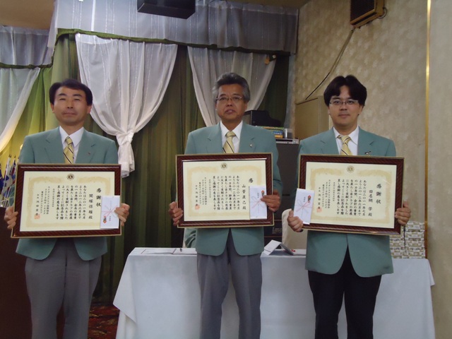 | 2012年7月4日(水)第一例会 一年間御協力ありがとうございました。 新年度の第一例会が、秀山荘にて行われました。新年度、池田宣常会長より、前年度三役に 感謝状及び記念品の贈呈を行ない、引き続き出席率優秀者表彰が行われました。 |